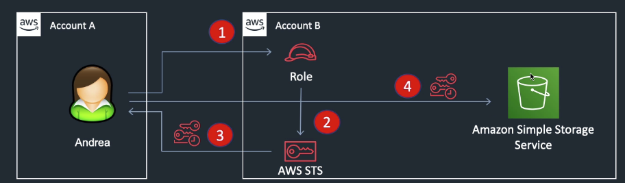 Given below is an example in which a user in account (A) assumes a role specified in another account (B) to get temp credentials via STS to access the S3 bucket.