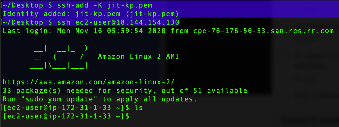 ~/Desktop $ ssh -A ec2-user@18.144.60.58 # Agent forwarding to public instance