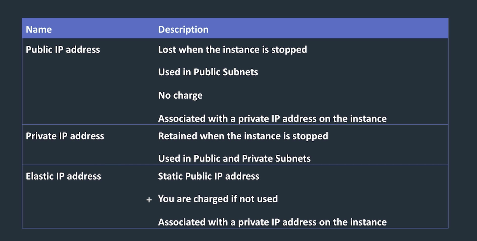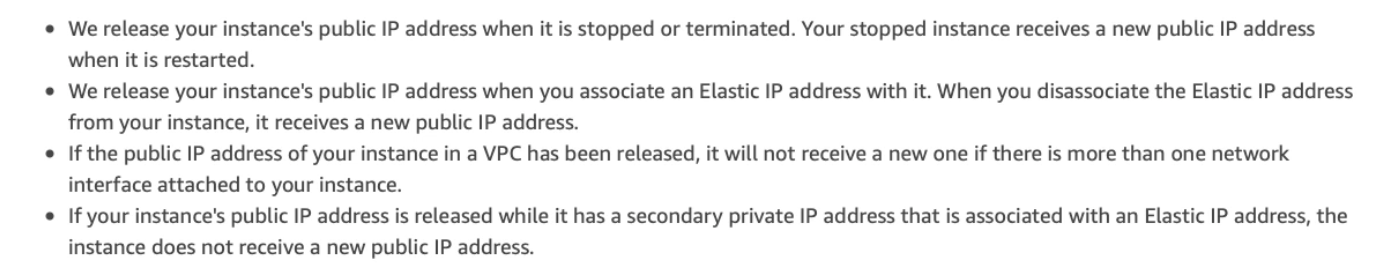Note : Public IP addresses are retained during a reboot, but once stopped or terminated its released.