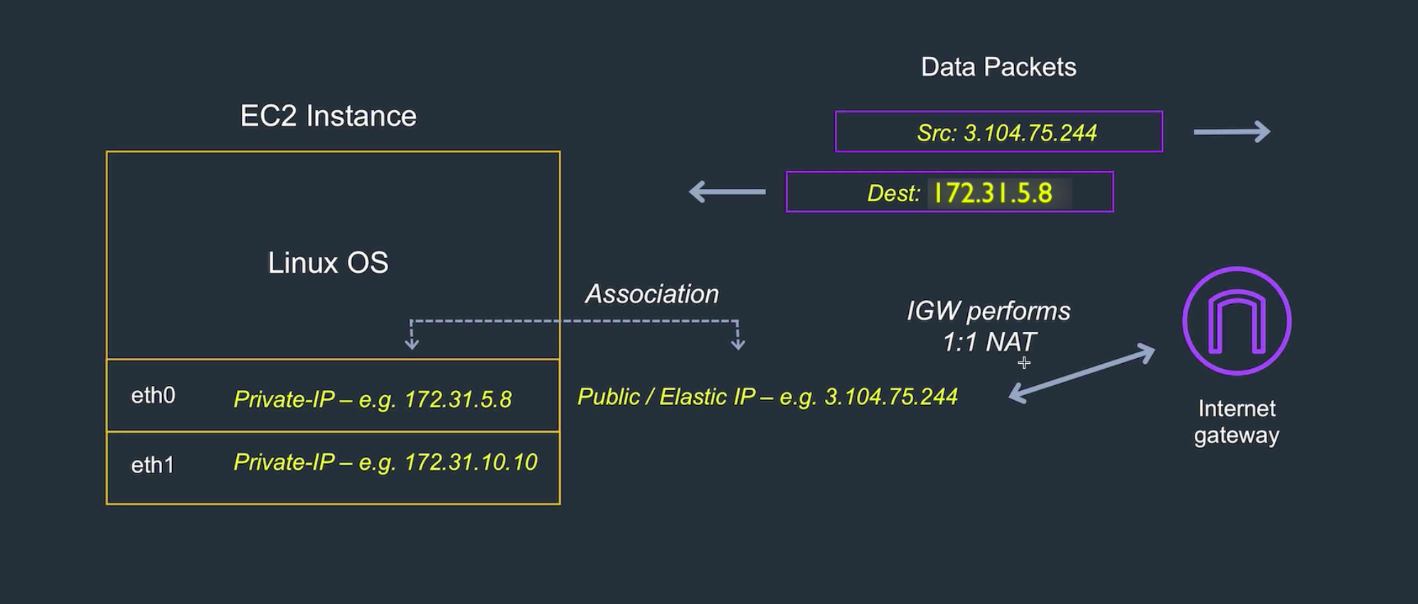 By default every EC2 Instance comes with a default network interface “eth0”.Private IP address is known only to the Operating System.Its part of the Network Interface. Its the NAT (Network Address Translator) maps the public IP to the actual private address your Network Interface is mapped to and vice versa for outbound traffic too. Private IP is with in the CIDR block range of your subnet and thats what we see when we do an ifconfig.