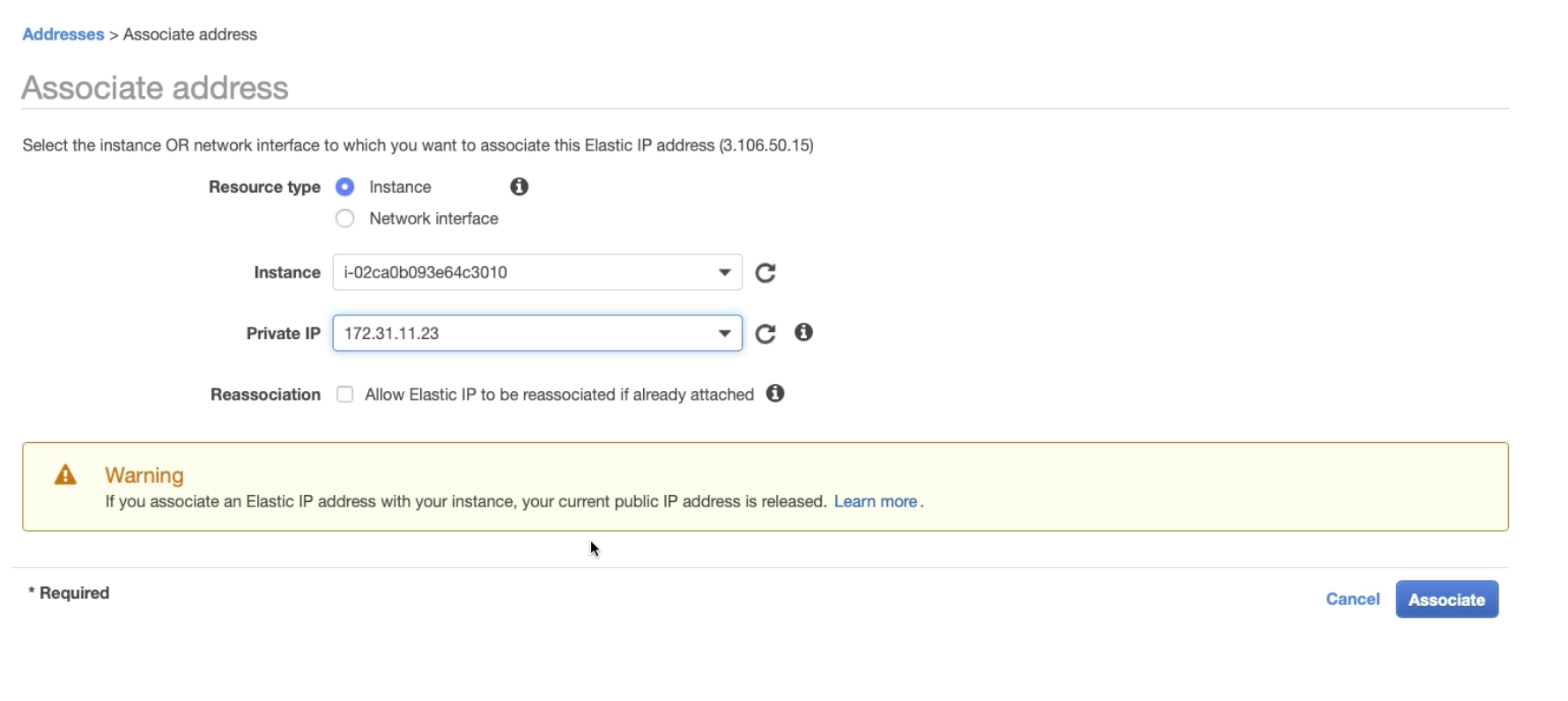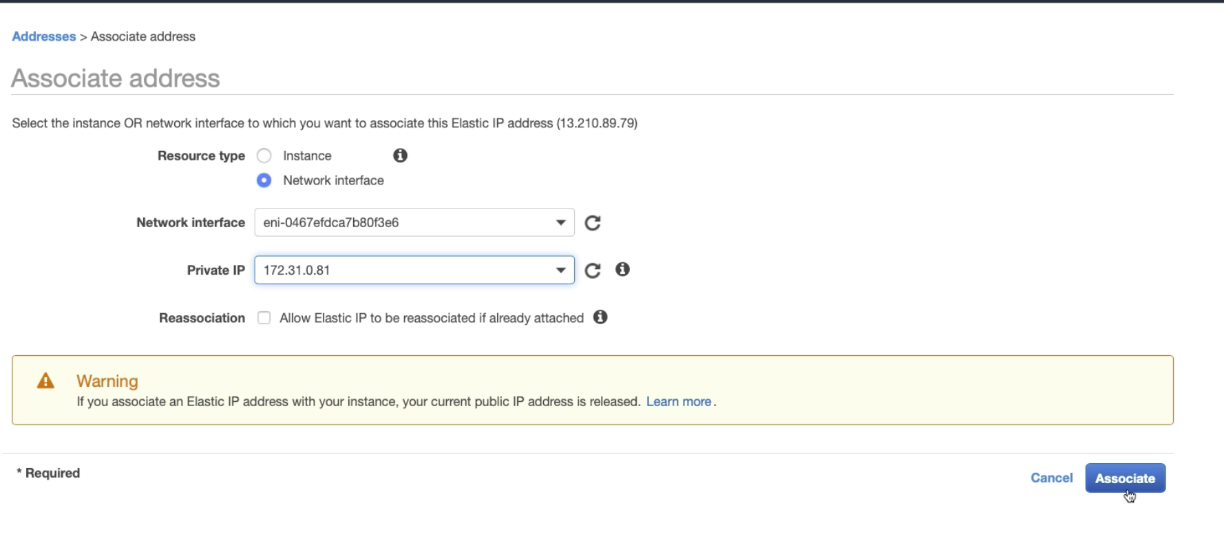 - Associate the Elastic IP with your instance default network interface.