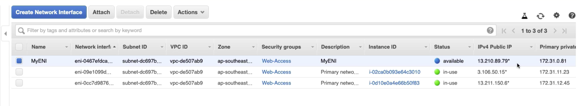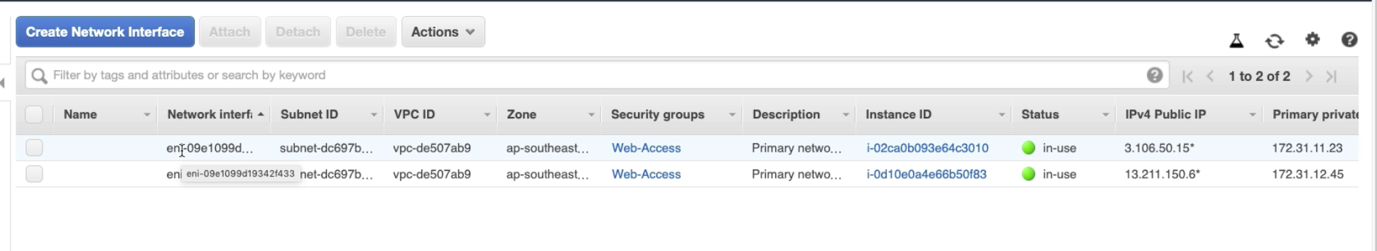 So far we are talking about default Network Interface (eth0) when we create an EC2 Instance. In my case I have two EC2 instances, that means if you check Network Interfaces, you can see two Network Interfaces.