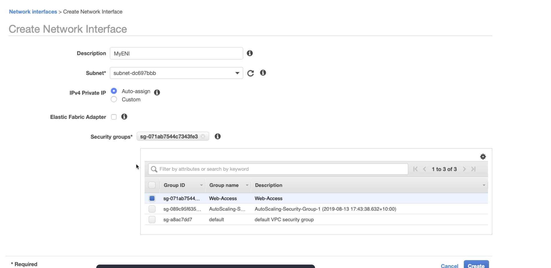 Create a new Network Interface and select a security group for Network Interface.