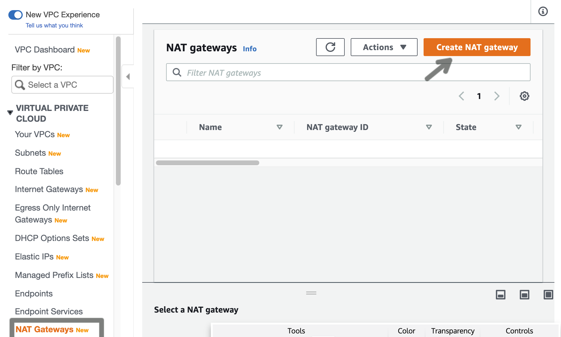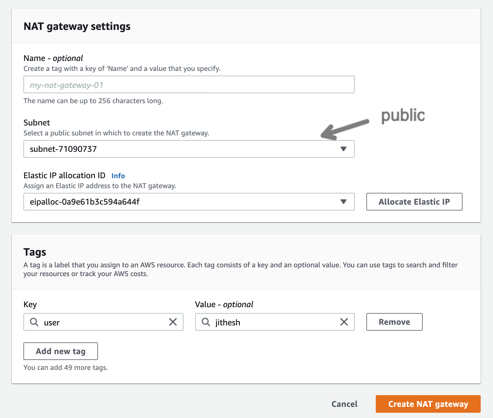 Let us create a NAT gateway. Go to the VPC console and → Create NAT Gateway