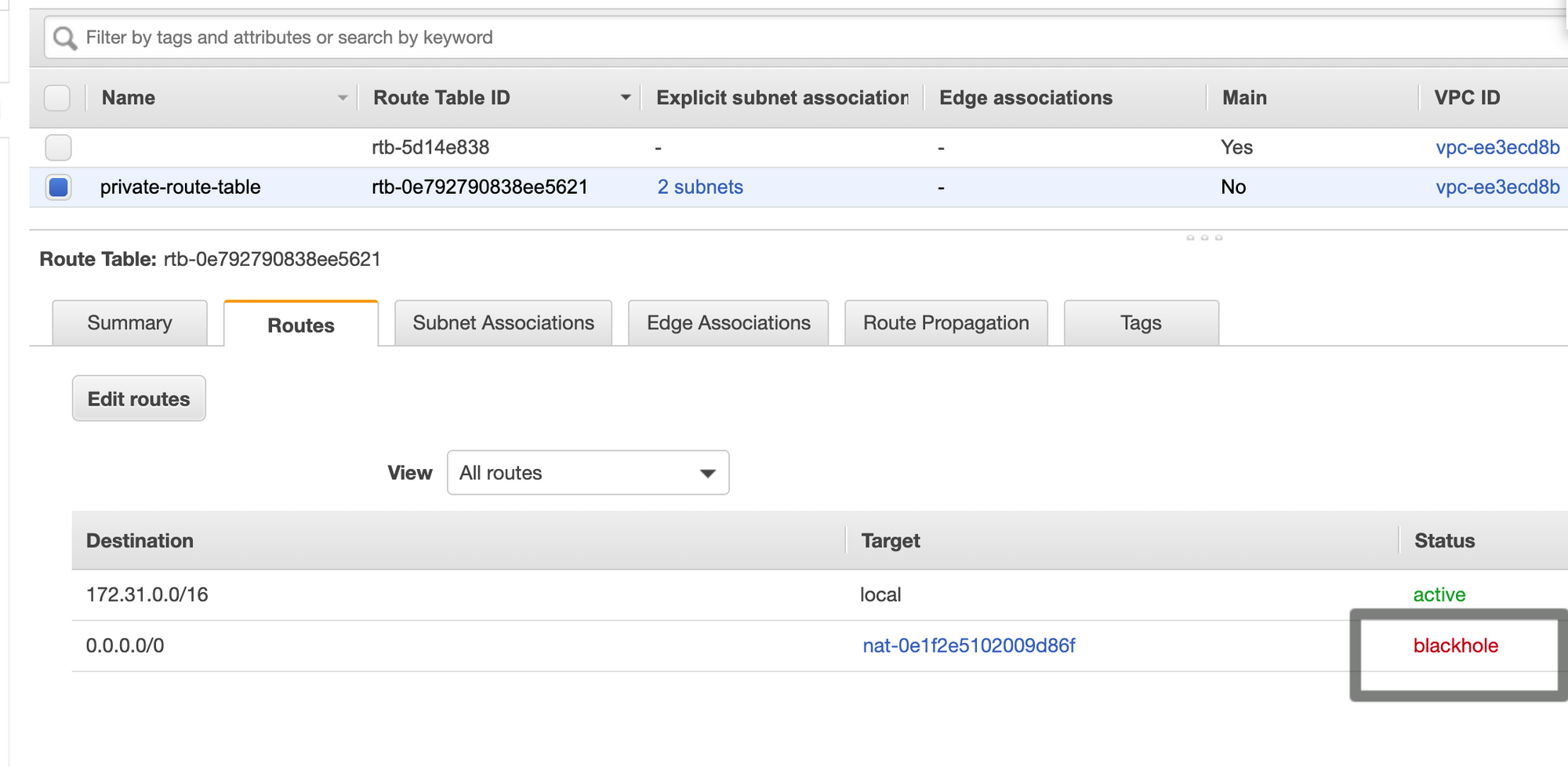 Now our route table shows black hole since we don’t have NAT Gateway.