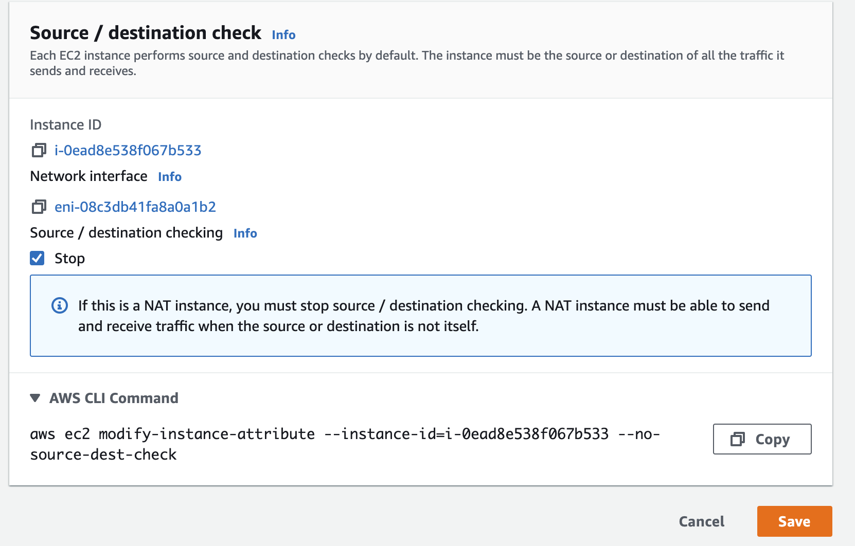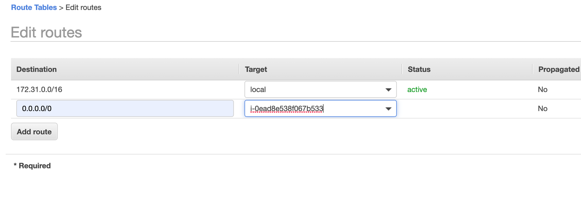 Now note down the instance ID and edit route table of your private instance and provide the instance id of the new NAT instance we created.