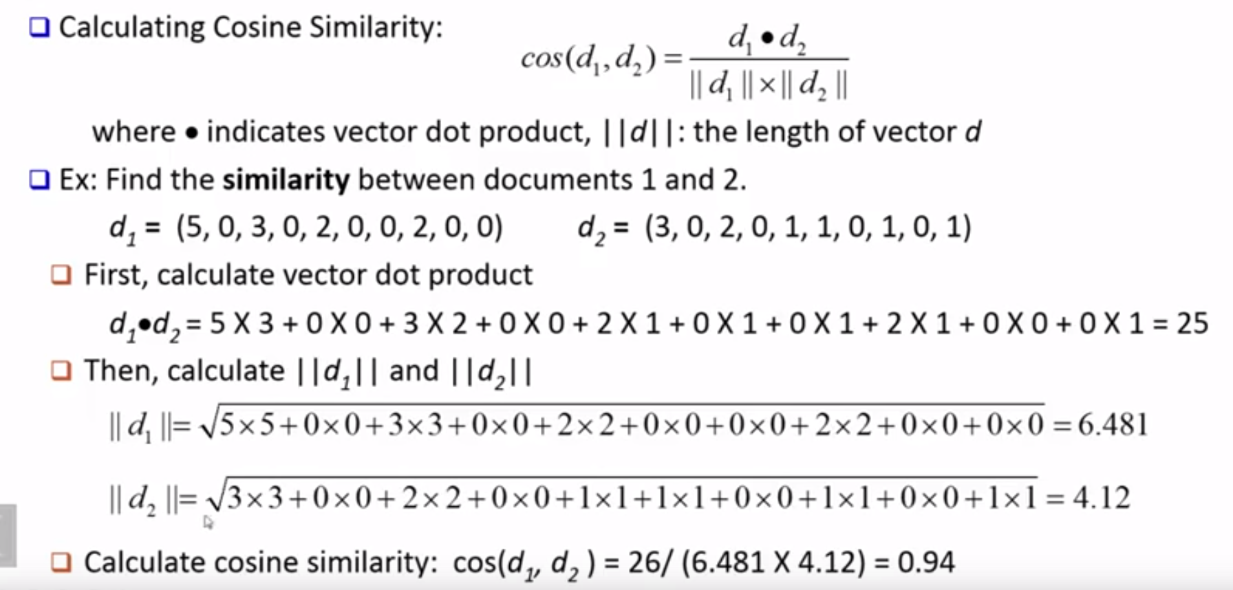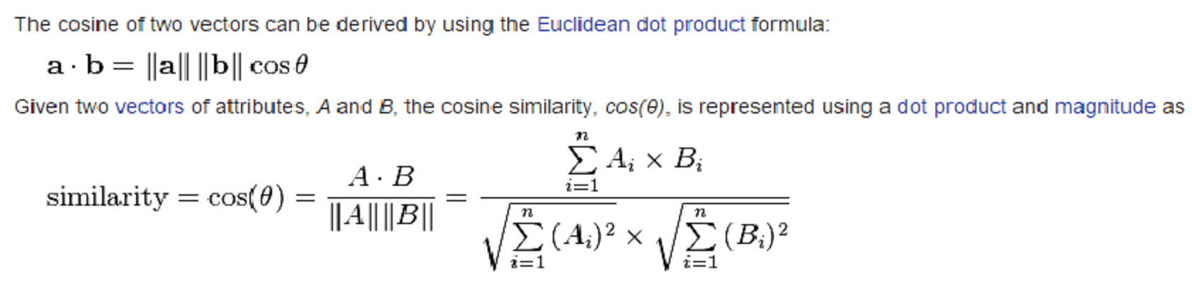 Cosine similarity is widely used in data mining, recommendation systems, information retrieval .Here we will be discussing Cosine similarity as a proximity measure between two vectors. The cosine of 0° is 1, and it is less than 1 for any other angle. It is thus a judgment of orientation and not magnitude: two vectors with the same orientation have a cosine similarity of 1, two vectors at 90° have a similarity of 0, and two vectors diametrically opposed have a similarity of -1, independent of their magnitude. Cosine similarity is particularly used in positive space, where the outcome is neatly bounded in [0,1].