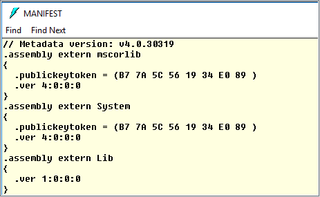 ILDASM is a handy tool to view assembly level information. For example you can see the dependent assemblies of a particular assembly as shown below. In this case you can see this assembly depends on mscorlib, system and Lib assembly.